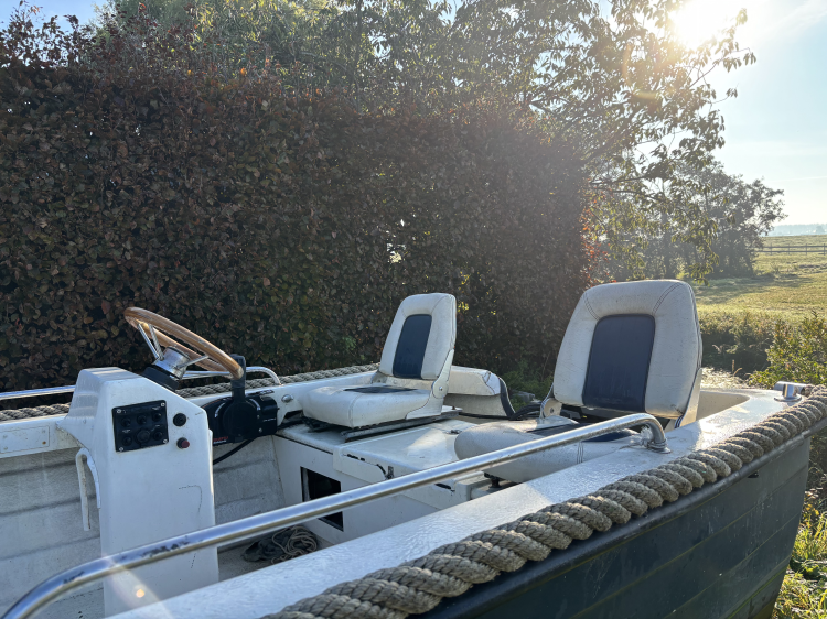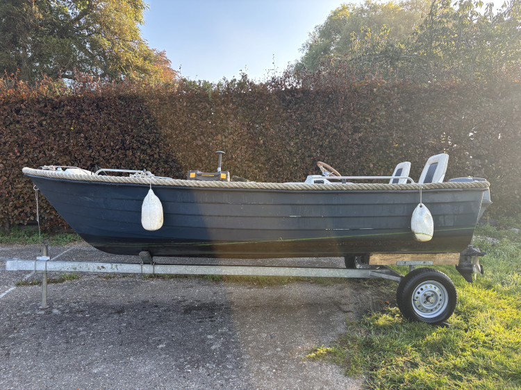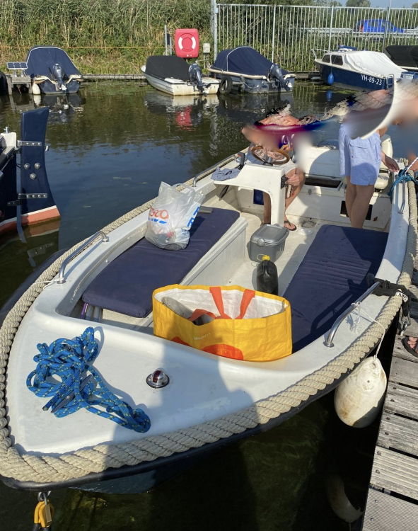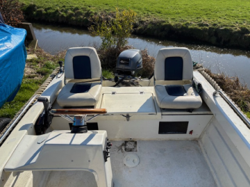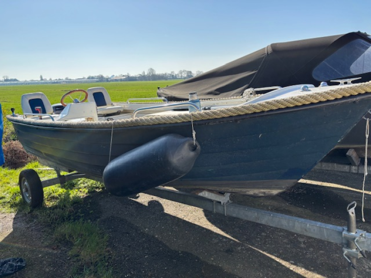 Achterop hangt een 9.9 pk buitenboordmotor van Yamaha, bouwjaar 2000 (type 6G8-87).